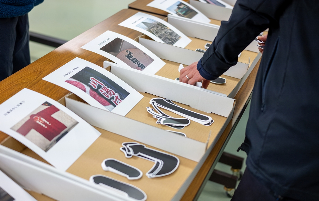 コンセプトは「これまでの継承と再構築」。川湯温泉街をみなさんと歩き、川湯神社や看板・標識、廃ホテルの名前や商品名などから「川」の文字を採集。それらの意味を考えながら組み合わせることで、新しい「川」の文字をデザインしました。