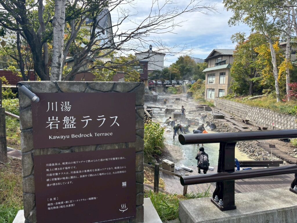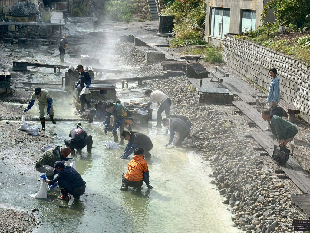 川底の岩盤を傷つけてはいけないので重機やシャベル等も使えず、長靴と手袋を着用し源泉が流れる熱い温泉川の中、みなさん汗を流しながら手作業で一生懸命頑張ってくれました。