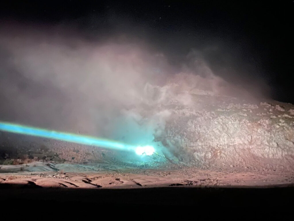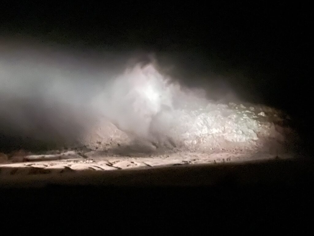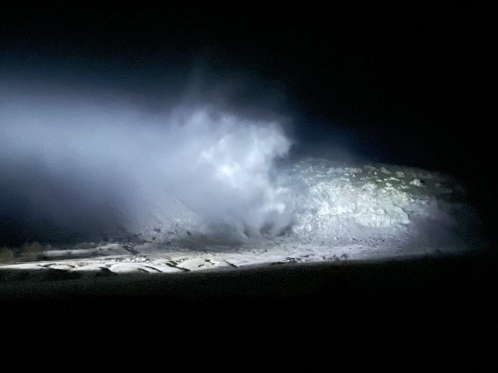 真っ暗闇の中、ライトに照らされたアトサヌプリの白い岩肌と噴煙が際立ちます。