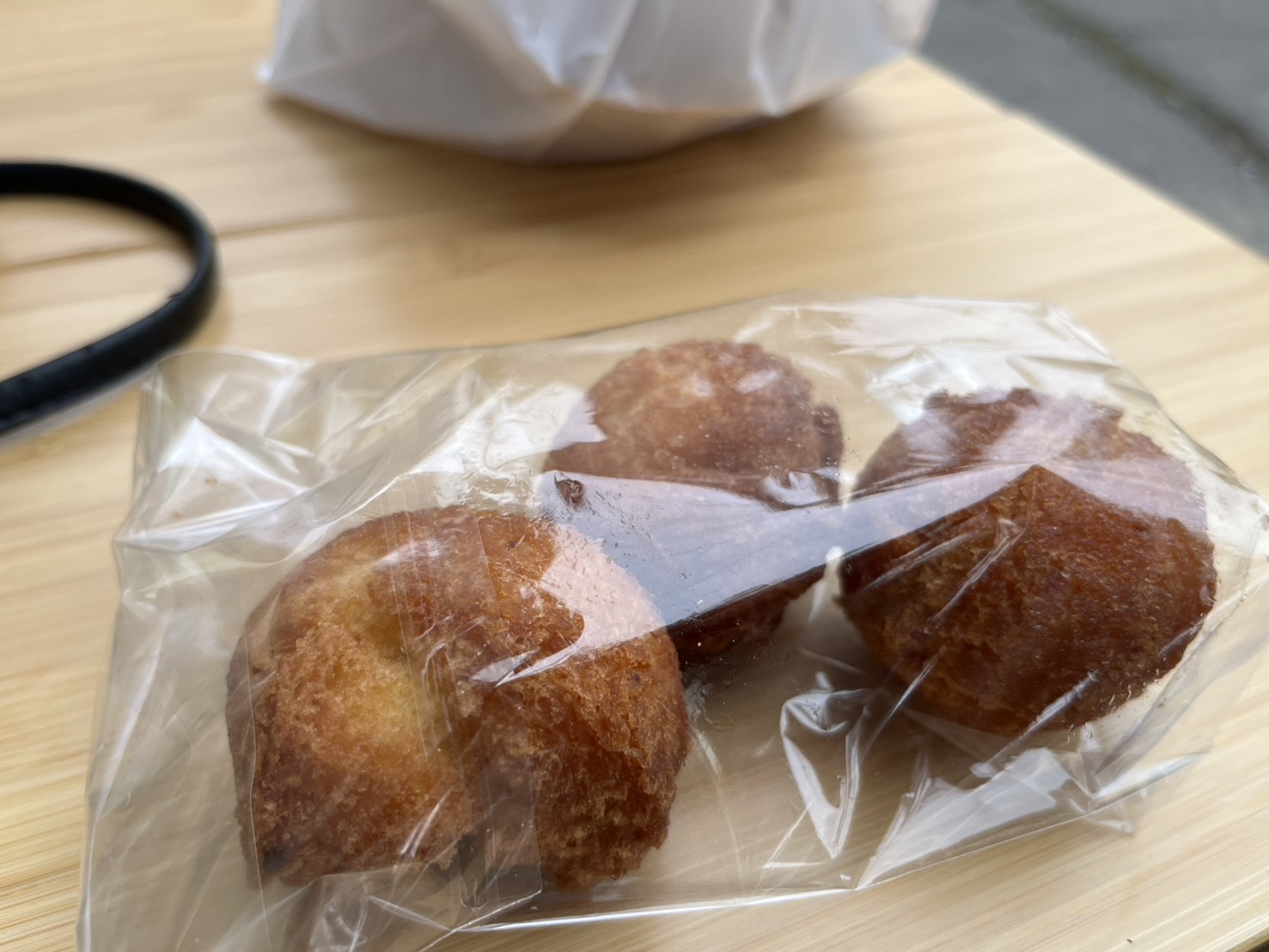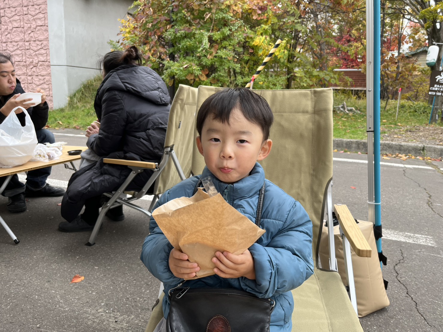 続いて、石花木金さん「弟子屈ポークホットドック」息子は源平さんの「源コロバーガ一」「かぼちゃドーナツ」を立て続けに頂きました。(美味しいっ!)
