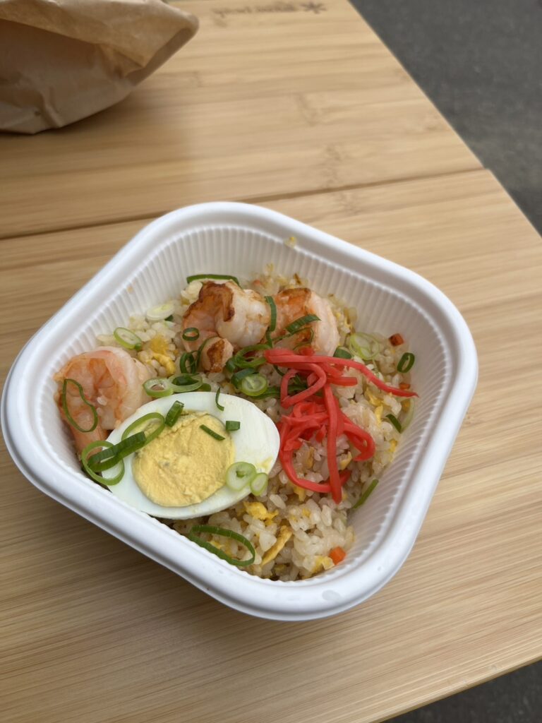早速、私も良い匂いに誘われ、まるはちさんの「えびのっけチャーハン」を頂きました。