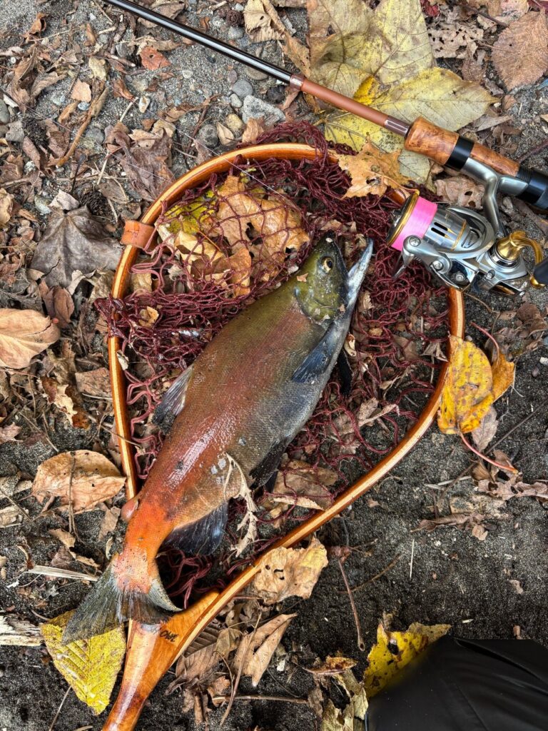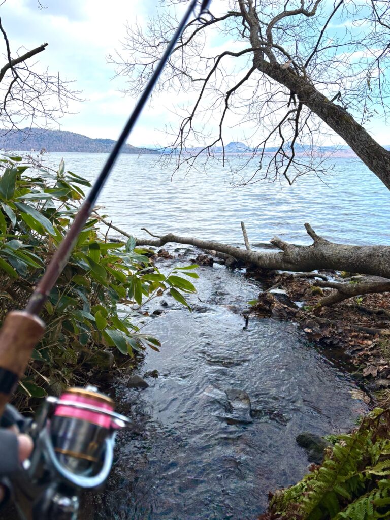 みんな思い思いのポイントで、どんな大物に会えるのかと考えながらキャスティングをしていると、ヒメマスがヒット!写真を撮り、寒さを忘れたのも束の間、風が冷たく体感気温はマイナス、私はこれで終了。