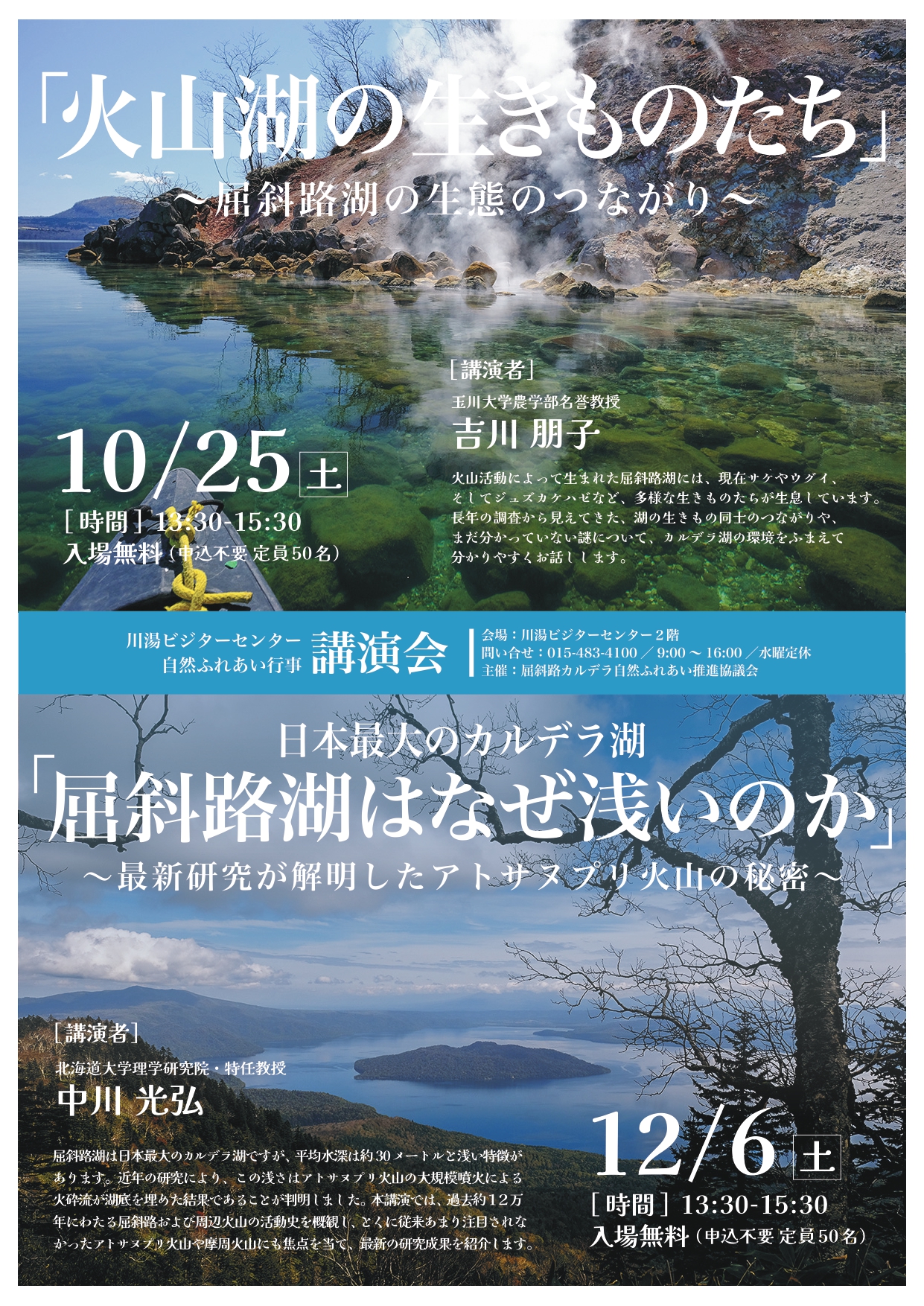 10月は玉川大学農学部名誉教授・吉川朋子氏にご登壇いただく講演会「火山湖の生きものたち〜屈斜路湖の生態のつながり〜」、また12月には講演会「屈斜路湖はなぜ浅いのか〜最新研究が解明したアトサヌプリ火山の秘密〜」北海道大学理学研究員・特任教授である中川光弘氏をお招きいたします。
